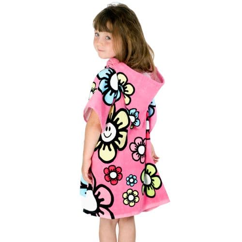 A soft 100% cotton Smile hooded poncho towel in a cute pink flower design. Provides UPF 50+ sun protection and comfortable coverage after swimming or beach play. Perfect for holidays, pool sessions, and sunny days. Suitable for ages 2–6 years