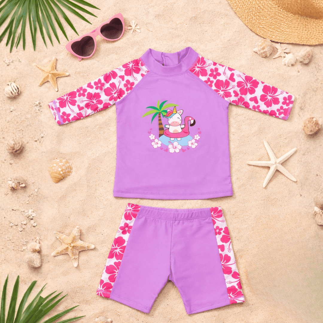 This Kidz Swimmers girls’ UPF 50+ rash vest top and swim shorts UV swimwear set features a fun Unicorn design and provides excellent sun protection for swimming, beach play and holidays. Made from soft, quick-dry fabric, it’s comfortable, durable and perfect for active little swimmers. Available in sizes 2–3, 3–4 and 5–6yrs.