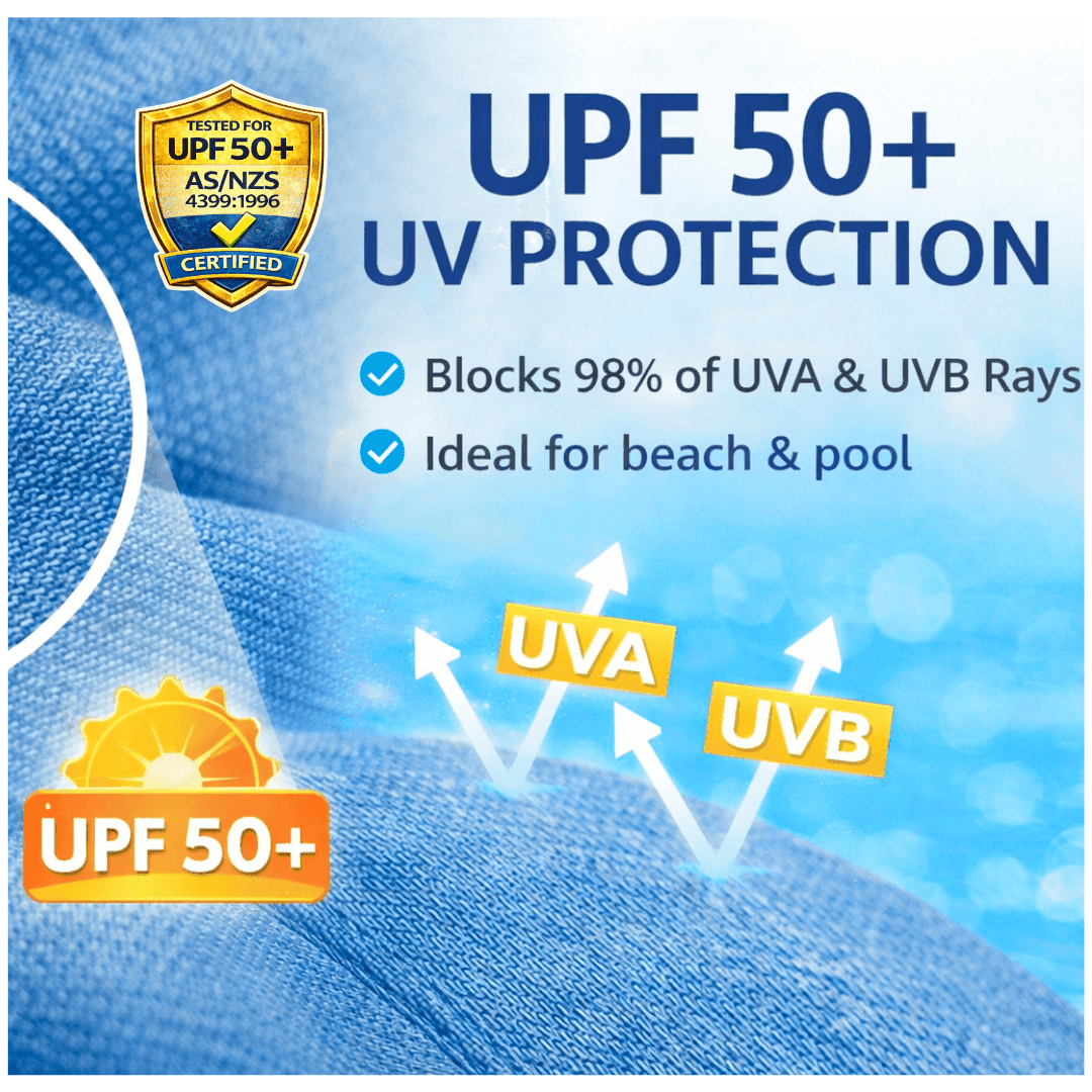 Kidz Swimmers Indigo Blue swim trunks offer UPF 50+ sun protection, perfect for beach days, holidays and active pool time. Made from soft, quick-dry fabric for comfort and durability. Available in 2-3 yrs, 3-4 yrs, 5-6 yrs, 7-8 yrs and 9-10 yrs, these surf-style shorts keep kids protected and stylish.