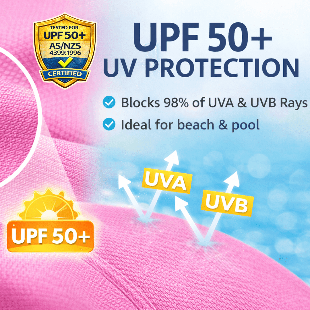 This Kidz Swimmers girls’ UPF 50+ long-sleeve swim top in Very Peri Purple and Fuchsia Pink provides excellent UV sun protection for swimming, beach days and holidays. Made from soft, quick-dry fabric, it offers comfortable, flexible coverage and pairs easily with any girls’ swimwear. Available in sizes 5-14 years.