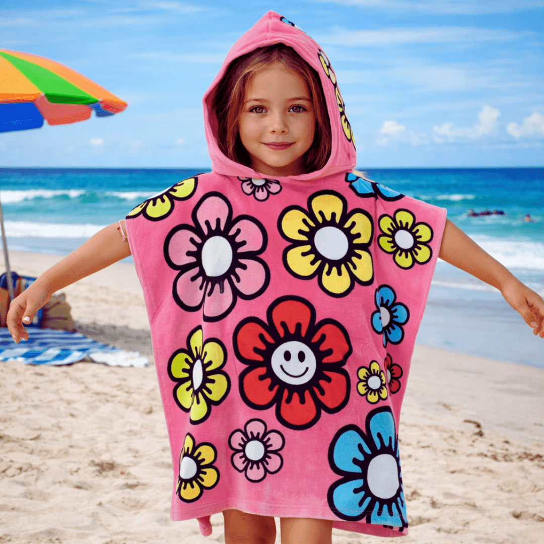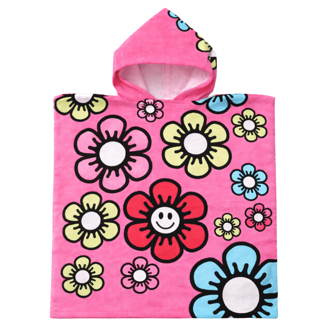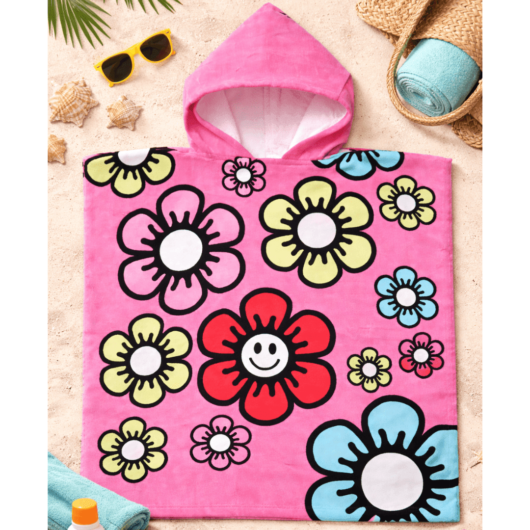 A soft 100% cotton Smile hooded poncho towel in a cute pink flower design. Provides UPF 50+ sun protection and comfortable coverage after swimming or beach play. Perfect for holidays, pool sessions, and sunny days. Suitable for ages 2–6 years