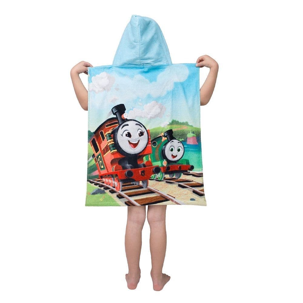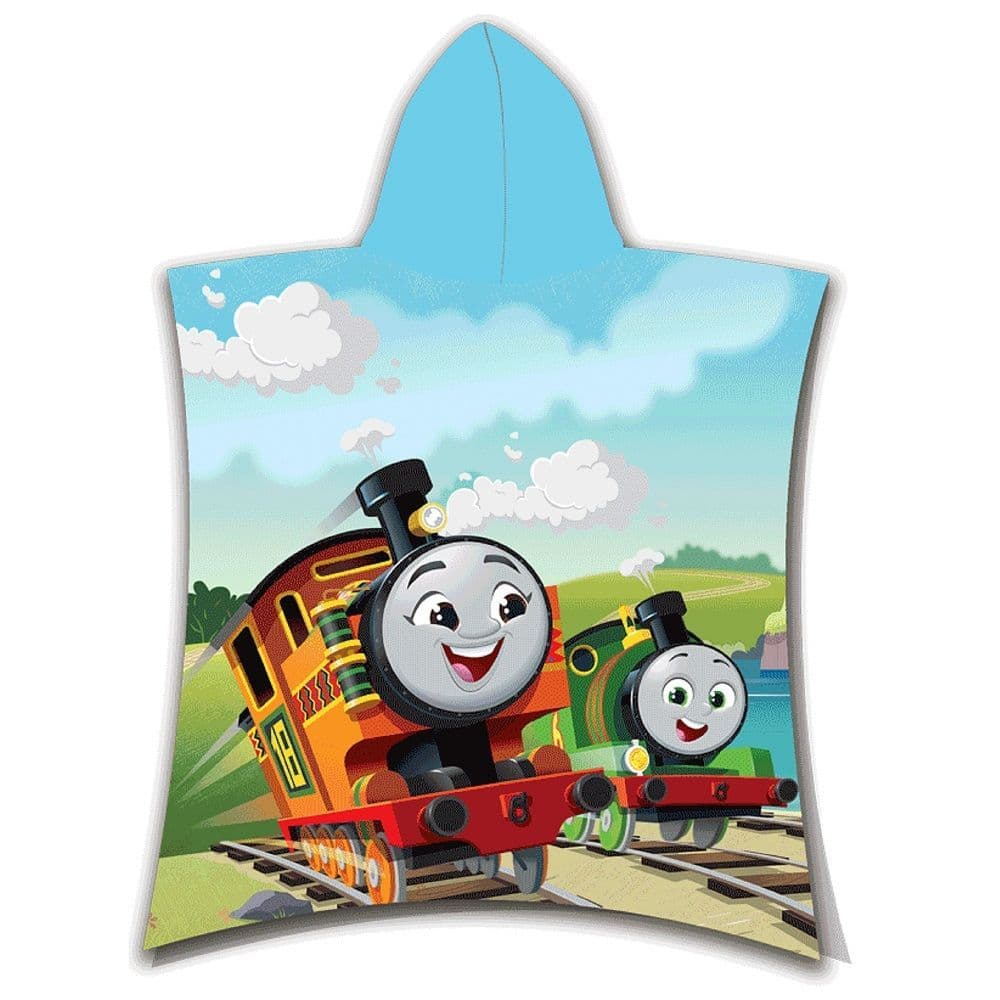 Cheerful Thomas the Tank Engine hooded poncho towel for kids aged 2–6 years. Made from 100% soft cotton with bright Thomas, Percy and Nia design. Perfect for swimming lessons, holidays, beach days or bath time. Cosy, quick-drying and easy to wash.